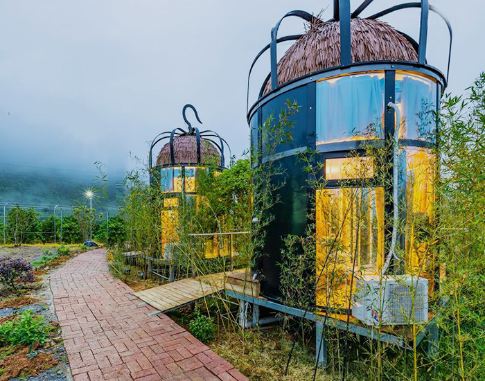 300型鸟笼民宿,直径三米,楼上楼下约15平方,总高度为4.5米,重约3.3吨。一楼配套客厅和卫生间,二楼卧室。